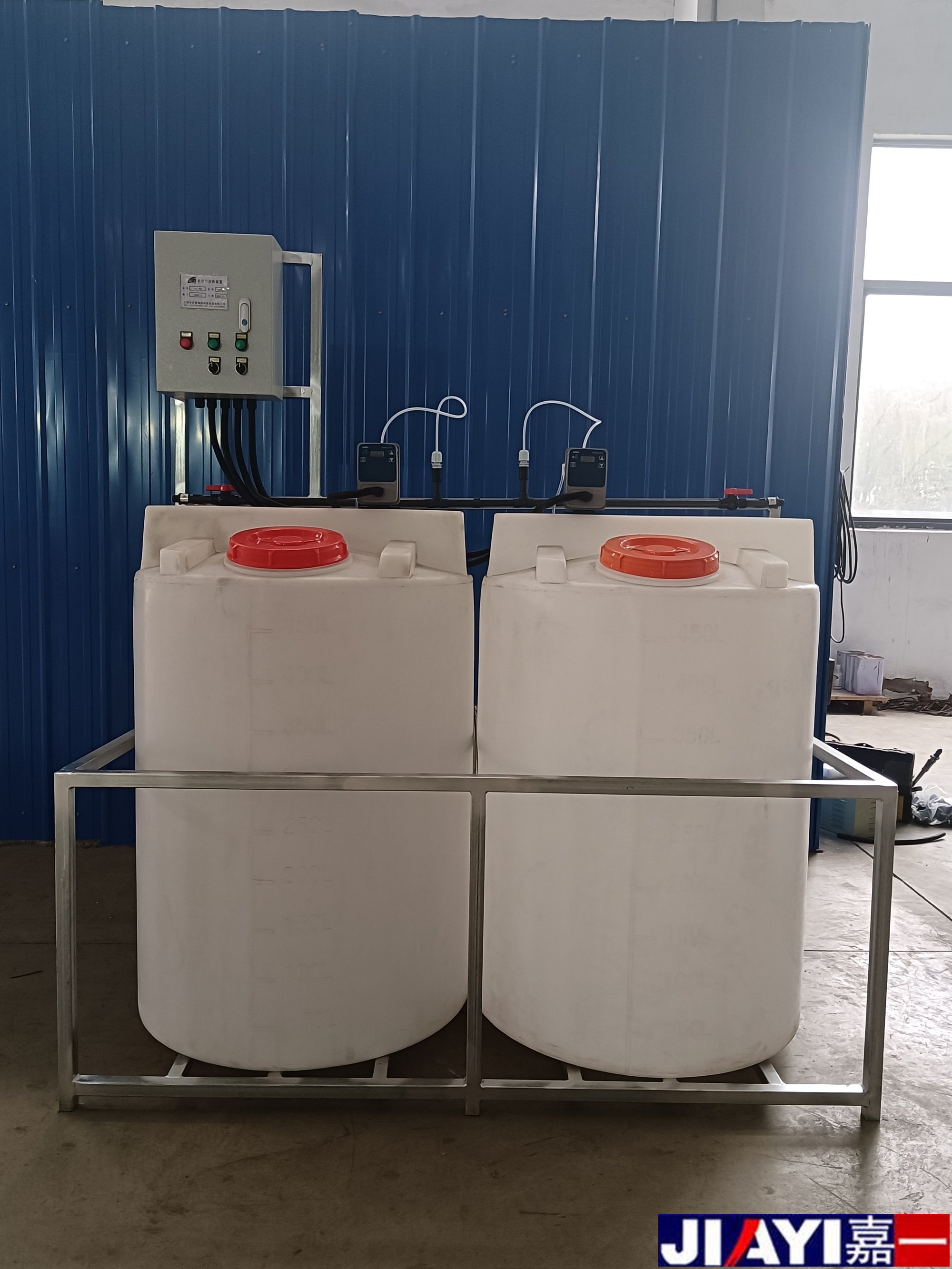 全自動加藥裝置采用時間程序控制,此控制方式無需儀表的支持,首先根據系統的運轉需要設定自動加藥的周期、加藥量、加藥時間和加藥頻率。在以后的系統運轉過程中,到加藥周期,計量泵自動打開加藥,加到規定的時間計量泵關閉;到排污周期,計量泵停止加藥,排到規定的時間后,計量泵繼續開啟,補充排污損失掉的藥劑,把系統的含藥量維持在正常的水平、加到規定的時間計量泵關閉。