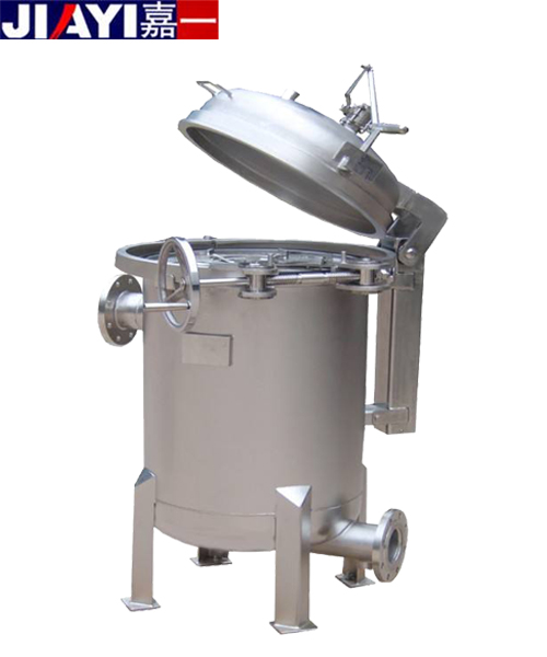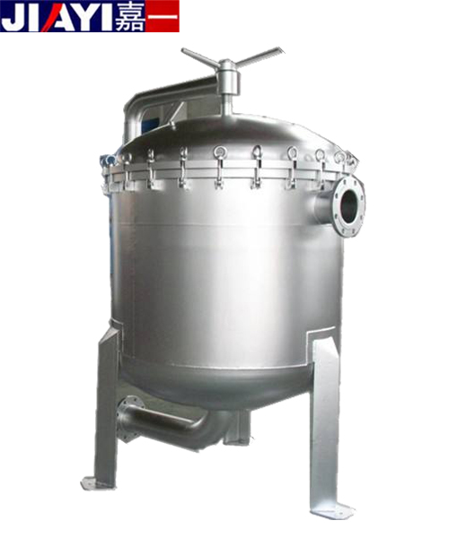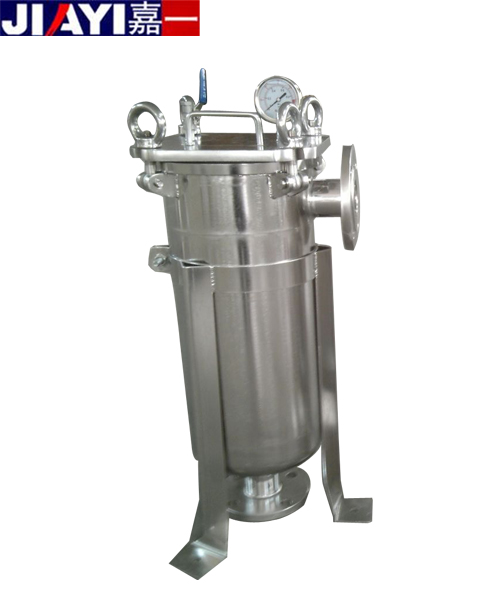 袋式過濾器的結構設計是由四套搖錘式環首螺栓將頂蓋和濾筒密封鎖緊,使過濾器更能承受極高的過濾壓力和水錘式的壓力沖擊。袋式過濾器由濾筒,過濾網籃,過濾袋三部分組成,結構緊湊簡單;要過濾的液體經過濾器的進口進入,流進過濾袋,經過濾袋的攔截后,由過濾器的出口流出。袋式過濾器的進出口設計一般采用側進底出方式,方便清洗。更換過濾袋簡單快捷, 首先,先關閉進水閥門,打開排氣閥,讓過濾器里面的壓力降到常壓;第二步,打開頂蓋上的四套環首螺栓,打開頂蓋;第三步,打開固定過濾袋的卡環,提出堵塞的過濾袋,換上新的過濾袋;第四步,關閉頂蓋,鎖緊四套環首螺栓;第五步,打開進水閥門,等排氣閥有液體流出時關閉排氣閥。總個過程一般在10-15分鐘左右完成。過濾器的維護:一般當過濾器的壓差達到2-3公斤時,證明過濾袋已經基本上堵塞了,這時過濾器的出口流出的液體也很少了,這時候應該更換過濾袋。根據使用的不同情況,如果工序要求需要保持過濾器的流量不低流量的一半,應該在壓差達到1公斤左右時更換過濾袋。過濾袋的使用壽命由原水的濁度、過濾的時間、過濾的流量、過濾袋的過濾面積來決定。