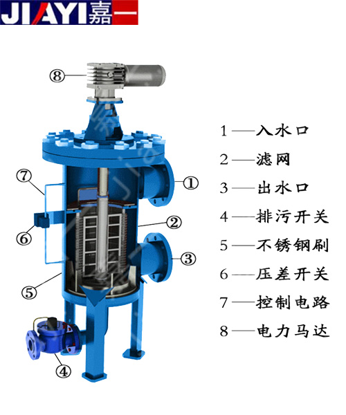 原理概述 當水從進水口進入過濾器過濾網,雜質被攔截在過濾網內壁,過濾后的干凈水從出水口流出,當濾筒內壁的雜質越積越多時,自清洗過濾器進出口的壓差達到預設值或達到清洗