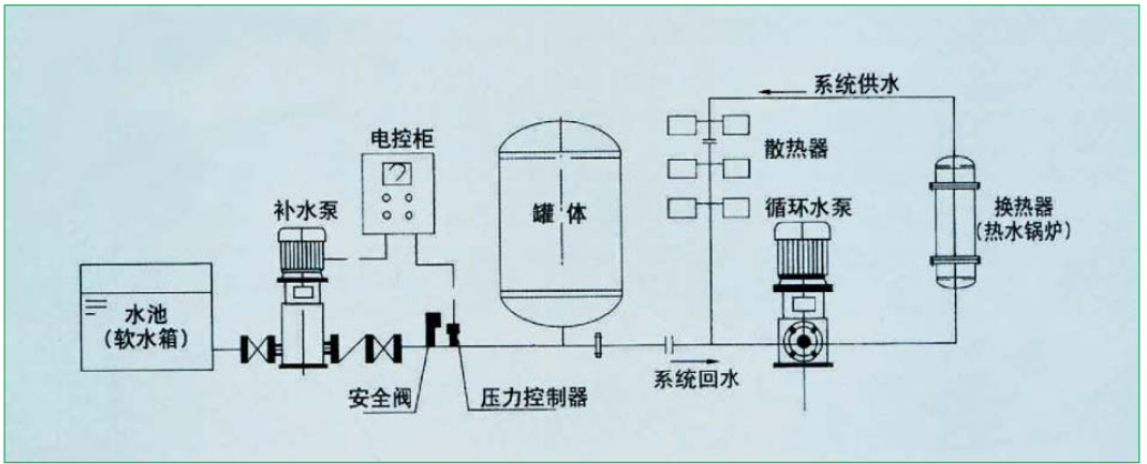 常壓定壓補水裝置設備采用系統靜壓作為膨脹水箱內的設計初始壓力水頭,采用保證系統內熱水不汽化的壓力作為膨脹水箱內動行終端壓力水頭。初始運行時首先啟動補水泵向系統及氣壓罐內的水室中充水,系統充滿后多余的水被擠進膠囊內。因為水的不可壓縮性,隨著水量的不斷增加,水室的體積也不斷的擴大而壓縮氣室,罐內的壓力也不斷的升高。當壓力達到設計壓力時,通過壓力控制器使補水泵關閉。當系統內的水受熱膨脹使系統壓力升高超過設計壓力時,多余的水通過安全閥排至補水箱循環使用,當系統中的水由于泄露或溫度下降而體積縮小,系統壓力降低時,膠囊中的水被不斷壓入管網補充系統的壓降損失,當系統壓力至設計允許的最低壓力時,通過壓力控制器使補水泵重新啟動向管網及氣壓罐內補水,如此周而復始。