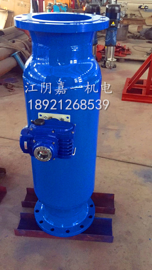 自動排污過濾器主要由優質碳鋼筒體、特殊結構的不銹鋼楔形濾網、電動執行機構及排污裝置所組成。當過濾器工作時,電動執行機構引導蝶閥處于開啟狀態,水流由入口進入過濾器,經過濾網過濾到出口。當過濾器需要排污時,關閉蝶閥,打開電動排污閥,水流經濾網前半段過濾,部分水流由出口流入系統,剩余水流由濾網后半段外側流入內側,經排污口排出,起到反向自動沖洗濾網的作用。這樣整個沖洗過程系統可正常運行,無需停機。