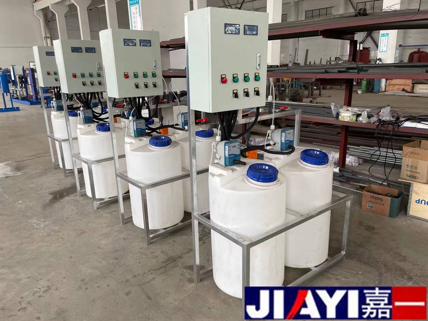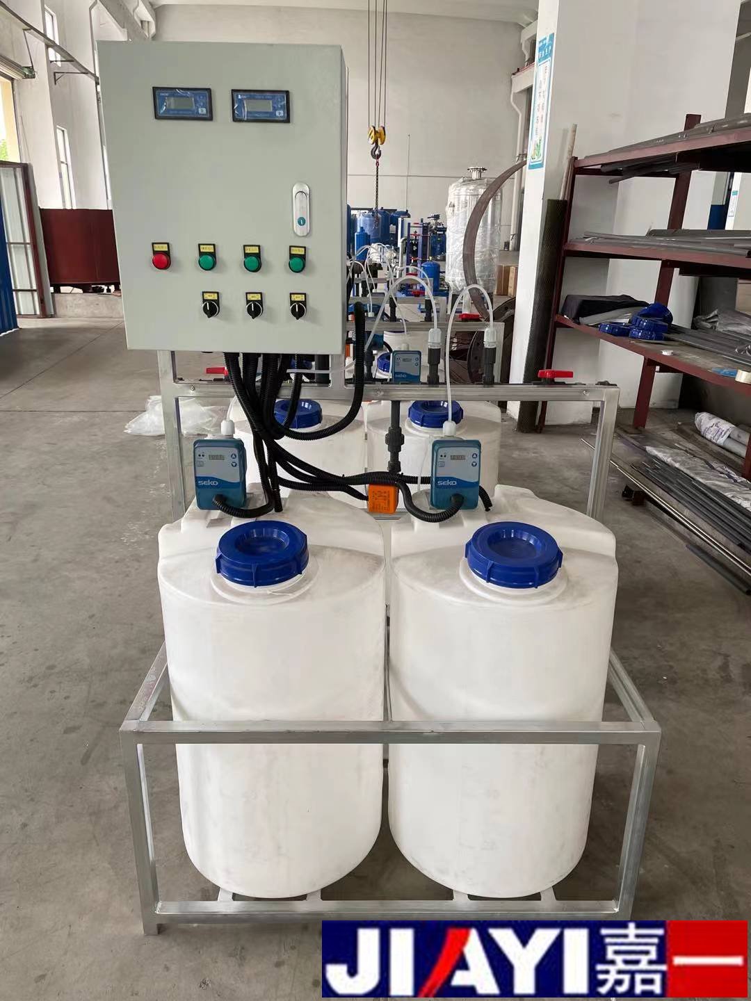 全自動加藥裝置采用時間程序控制,此控制方式無需儀表的支持,首先根據系統的運轉需要設定自動加藥的周期、加藥量、加藥時間和加藥頻率。在以后的系統運轉過程中,到加藥周期,計量泵自動打開加藥,加到規定的時間計量泵關閉;到排污周期,計量泵停止加藥,排到規定的時間后,計量泵繼續開啟,補充排污損失掉的藥劑,把系統的含藥量維持在正常的水平、加到規定的時間計量泵關閉。