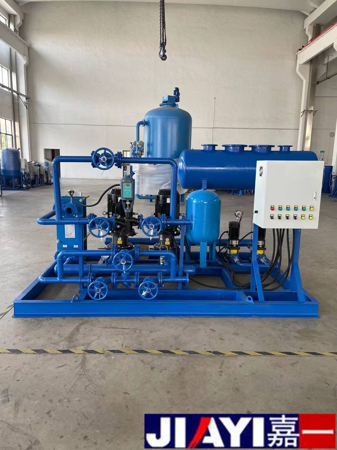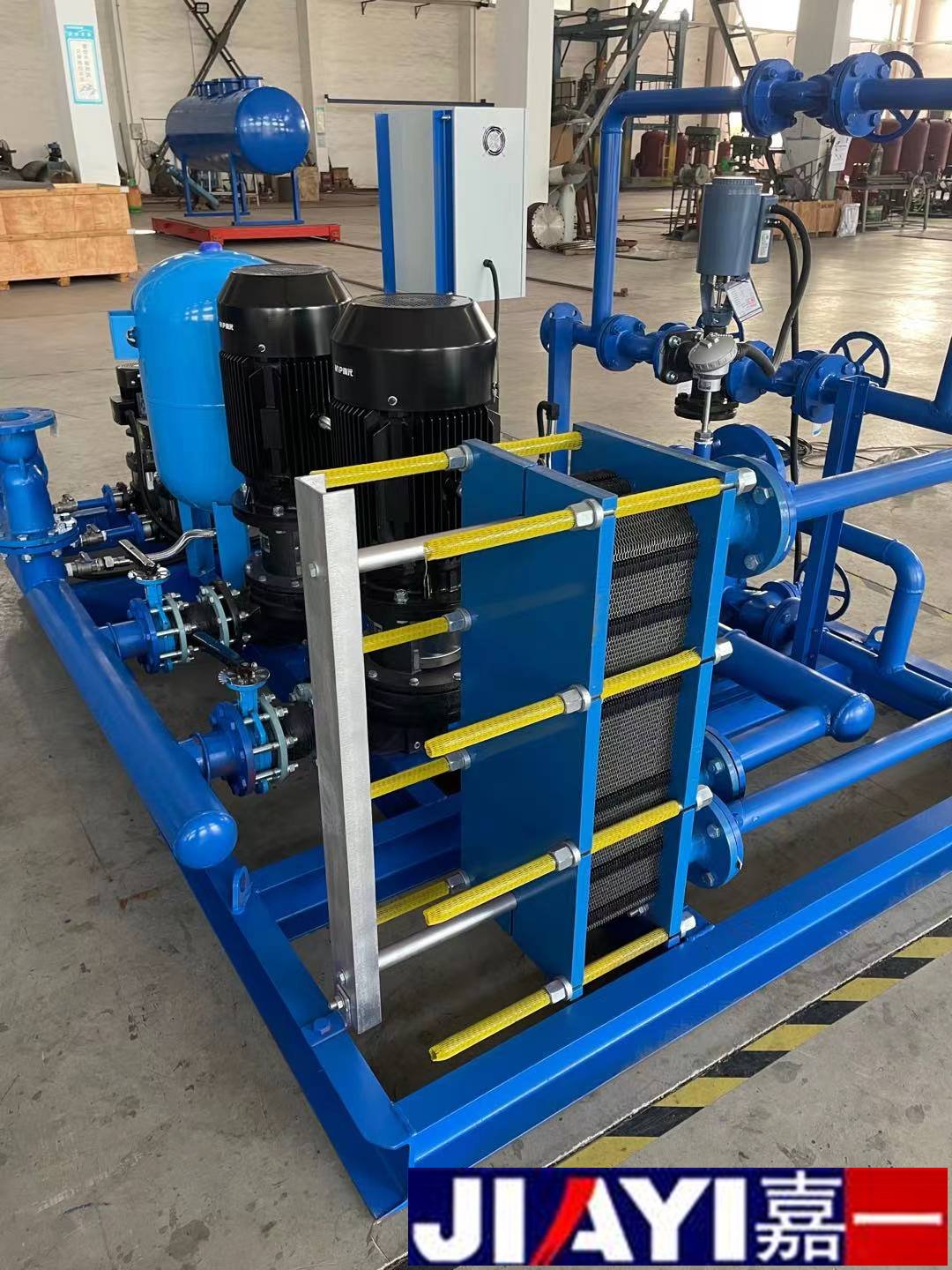板式換熱機組,為換熱機組的一種型號,其特點是采用板式換熱器,在相同壓力損失情況下,其傳熱系數比管式換熱器高3-5倍,占地面積為管式換熱器的三分之一,熱回收率高。設備由板式換熱器、溫控裝置、電控裝置、補水泵、穩壓膨脹水箱、補(凝)水箱、過濾器、閥門、儀表、傳感器、配管底座等組成。