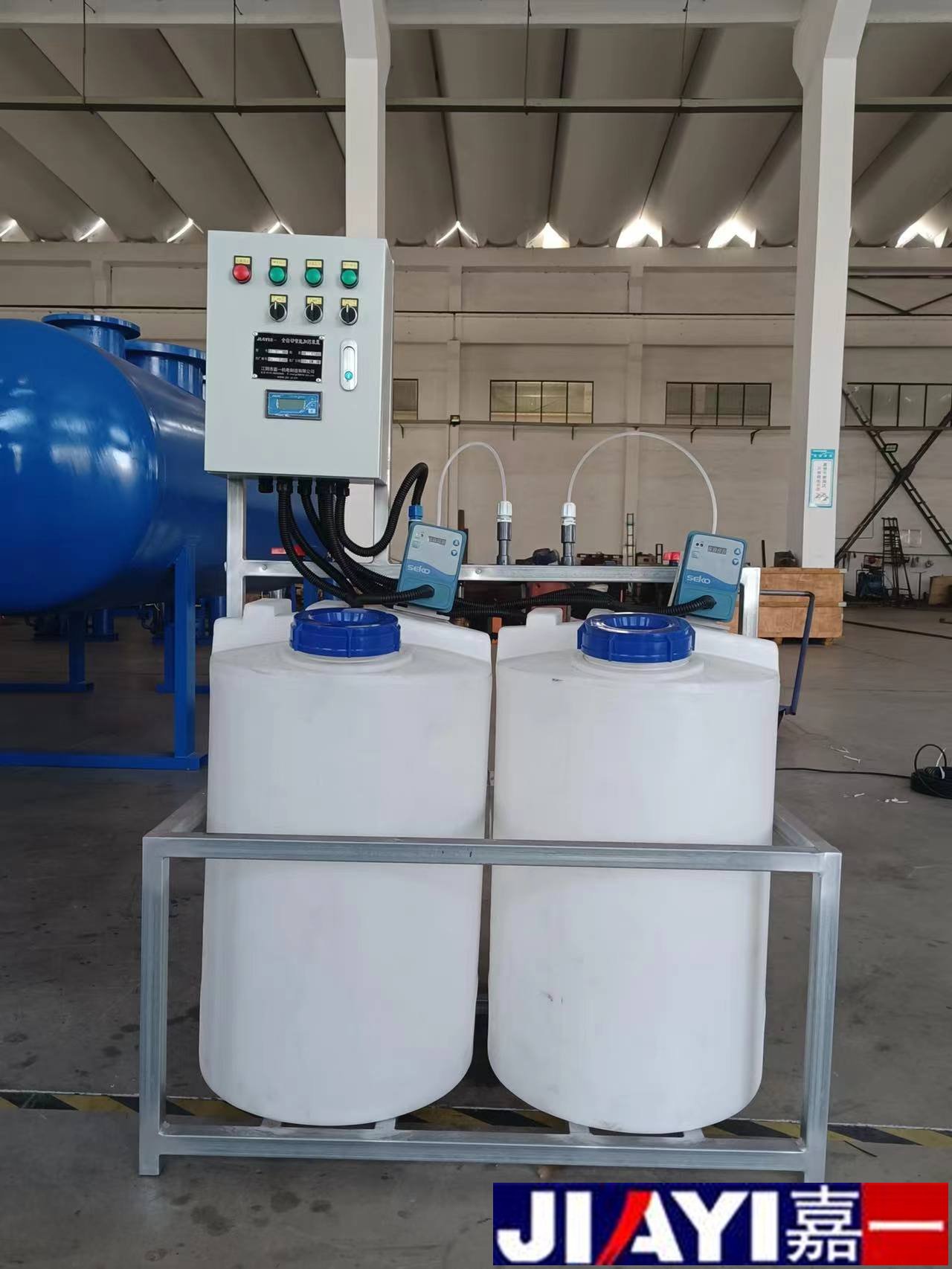 全自動加要裝置采用時間程序控制,此控制方式無需儀表的支持,首先根據系統的運轉需要設定自動加要的周期、加要量、加要時間和加要頻率。在以后的系統運轉過程中,到加要周期,計量泵自動打開加要,加到規定的時間計量泵關閉;到排污周期,計量泵停止加要,排到規定的時間后,計量泵繼續開啟,補充排污損失掉的要劑,把系統的含要量維持在正常的水平、加到規定的時間計量泵關閉。