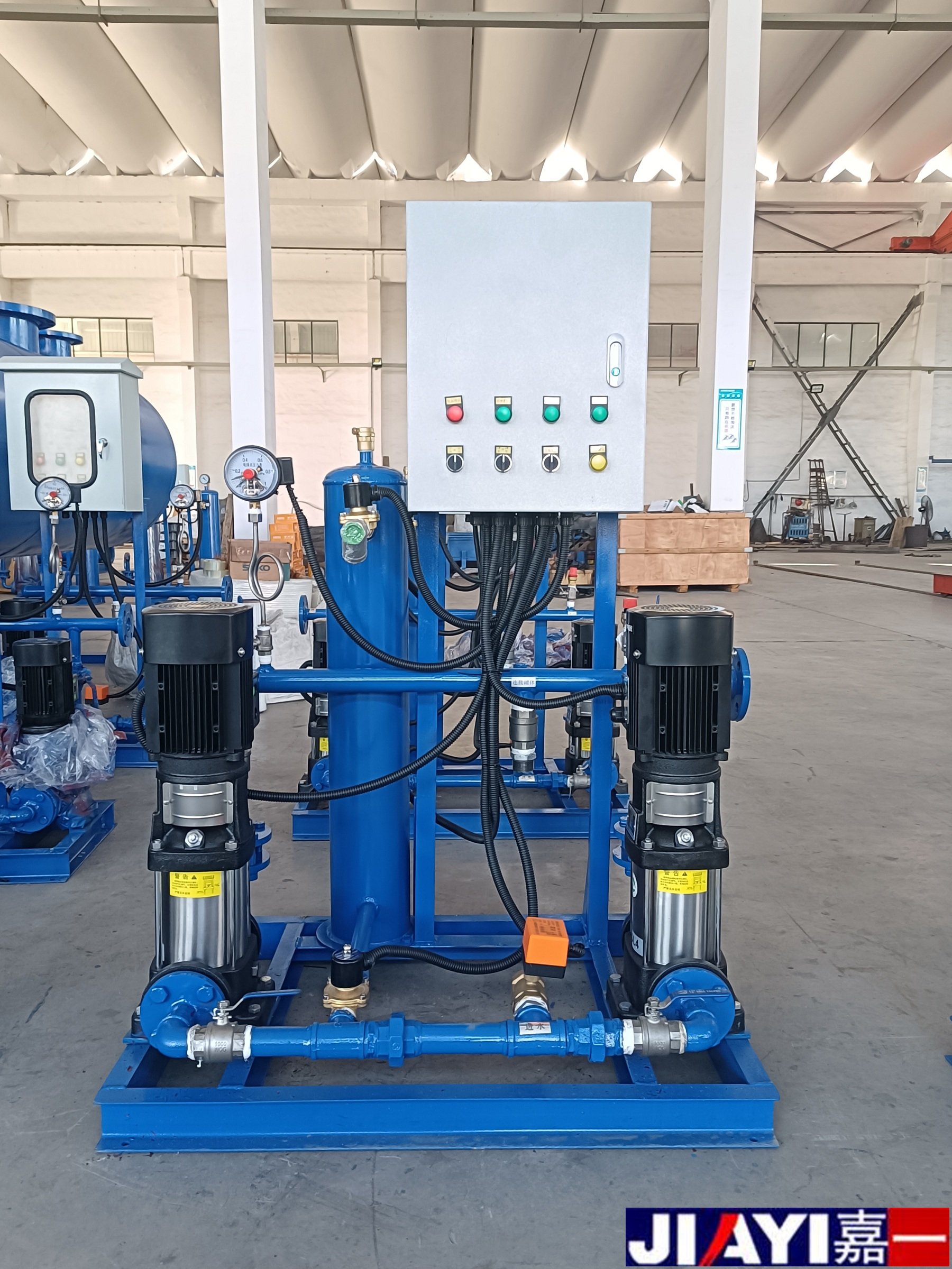 定壓補(bǔ)水機(jī)組由囊式壓力罐、水泵、控制箱、底架、壓力感應(yīng)裝置、管道閥門(mén)等組合而成,是一種兼有升壓、調(diào)節(jié)、儲(chǔ)水、供水等多種功能的常用供水設(shè)備。定壓補(bǔ)水機(jī)組利用氣壓罐的可調(diào)節(jié)能力,可自動(dòng)調(diào)節(jié)用戶水量的變化,當(dāng)用水量減少或不用水時(shí),可較長(zhǎng)時(shí)間不啟動(dòng)水泵,達(dá)到節(jié)能目的。與水塔、高位水箱相比可節(jié)省投資約40%-60%。該設(shè)備結(jié)構(gòu)緊湊,與其他傳統(tǒng)的供水裝置相比減少了占地面積,節(jié)省了土地資源。本設(shè)備全自動(dòng)運(yùn)行,無(wú)需專人管理,工作可靠。