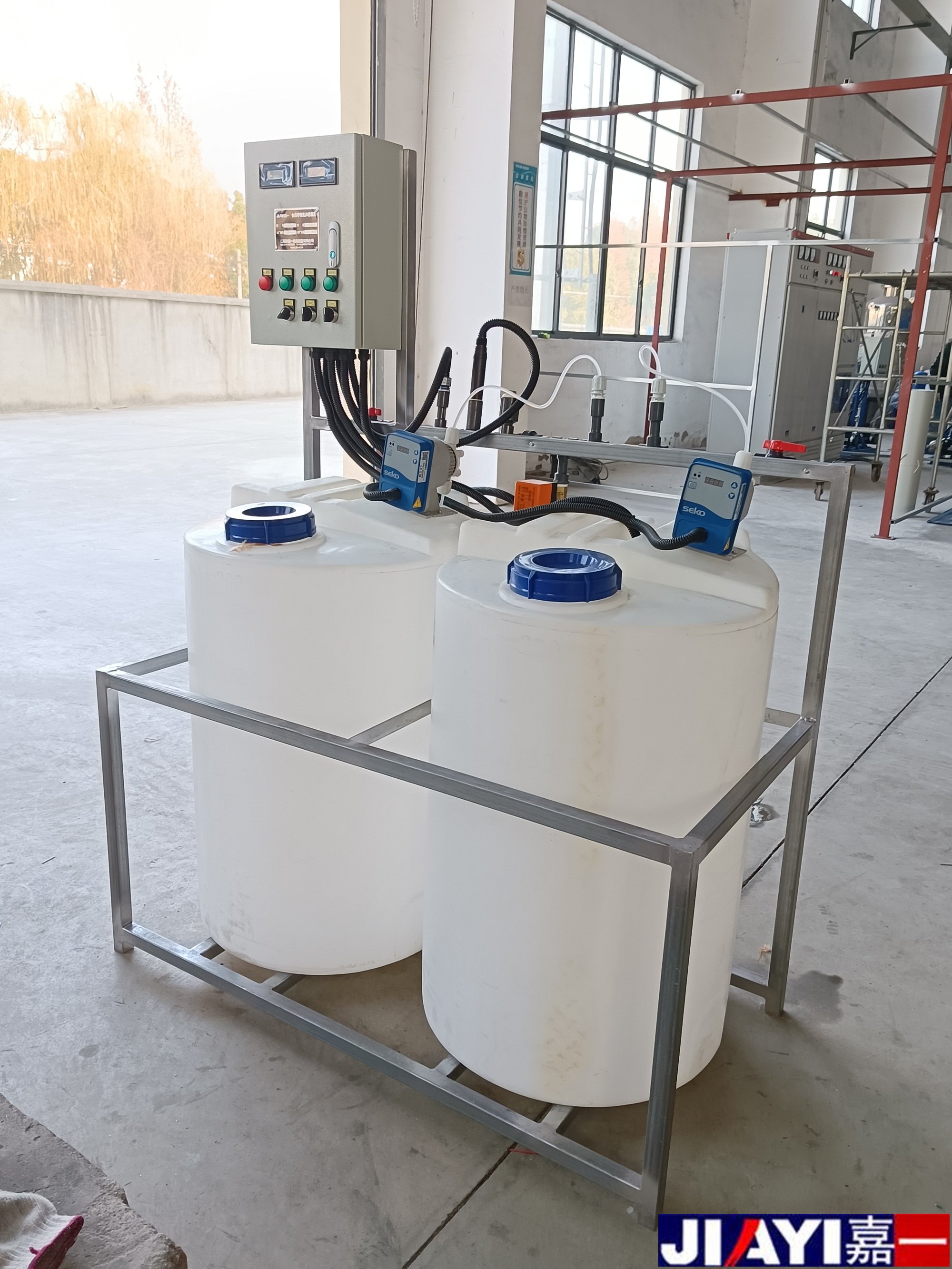 全自動加藥裝置采用時間程序控制,此控制方式無需儀表的支持,首先根據(jù)系統(tǒng)的運轉(zhuǎn)需要設(shè)定自動加藥的周期、加藥量、加藥時間和加藥頻率。在以后的系統(tǒng)運轉(zhuǎn)過程中,到加藥周期,計量泵自動打開加藥,加到規(guī)定的時間計量泵關(guān)閉;到排污周期,計量泵停止加藥,排到規(guī)定的時間后,計量泵繼續(xù)開啟,補充排污損失掉的藥劑,把系統(tǒng)的含藥量維持在正常的水平、加到規(guī)定的時間計量泵關(guān)閉。