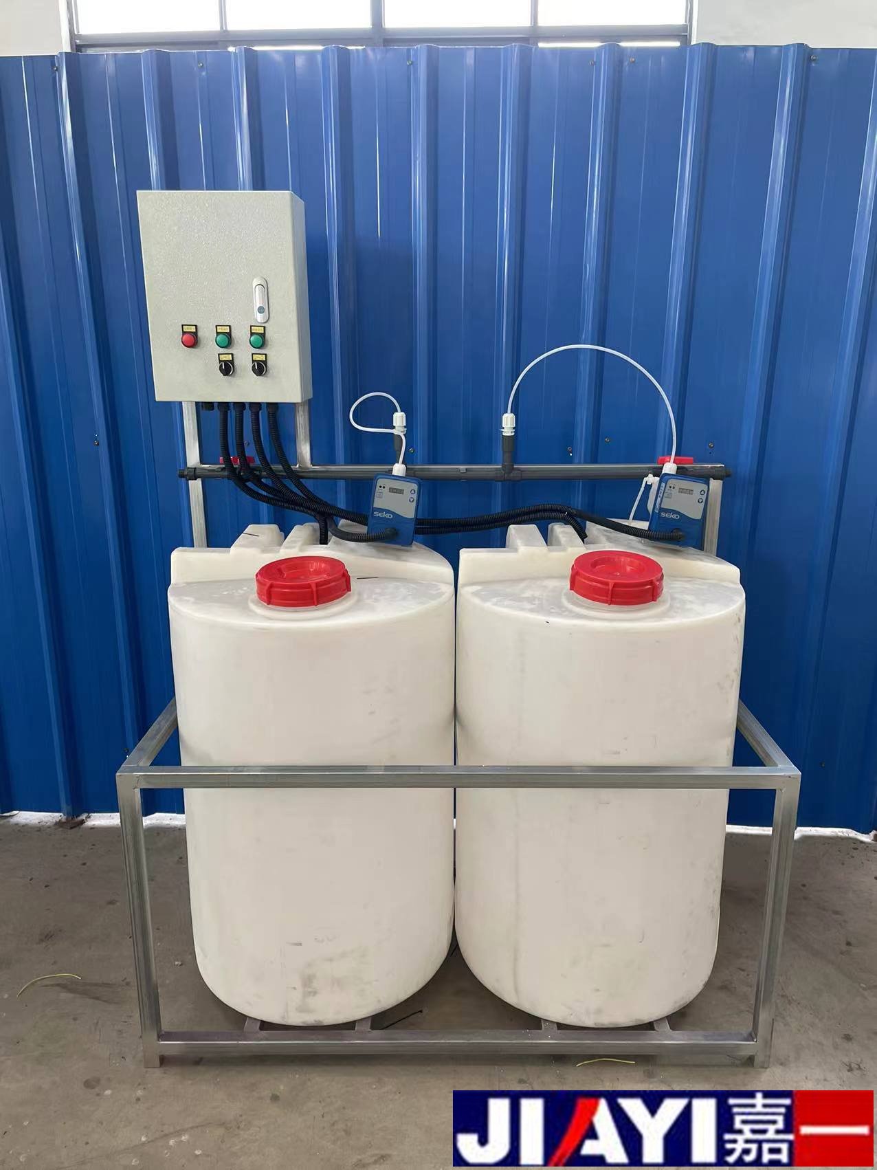 全自動加藥裝置采用時間程序控制,此控制方式無需儀表的支持,首先根據系統的運轉需要設定自動加藥的周期、加藥量、加藥時間和加藥頻率。在以后的系統運轉過程中,到加藥周期,計量泵自動打開加藥,加到規定的時間計量泵關閉;到排污周期,計量泵停止加藥,排到規定的時間后,計量泵繼續開啟,補充排污損失掉的藥劑,把系統的含藥量維持在正常的水平、加到規定的時間計量泵關閉。