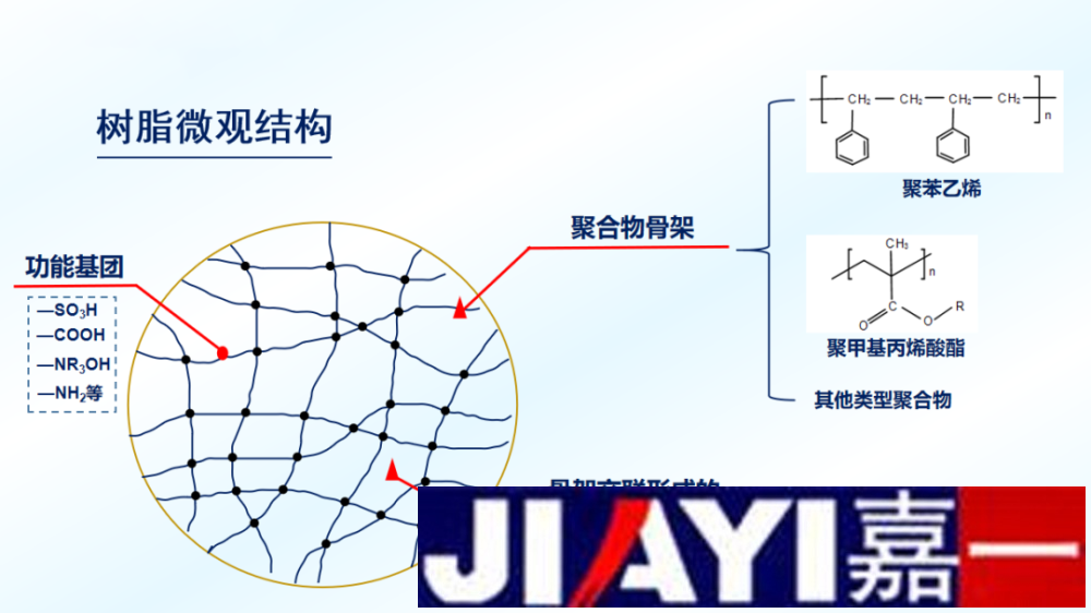 樹脂的特點,其單元結構主要由三部分組成:不溶性的三維空間網狀骨架、連接在骨架上的功能基和功能基團所帶的相反電荷的可交換離子。隨著離子交換技術的不斷發展,樹脂在水處理領域的應用不斷擴大,越來越顯示出它的優越性,具有可深度凈化、效率高、可再生性強等優點。