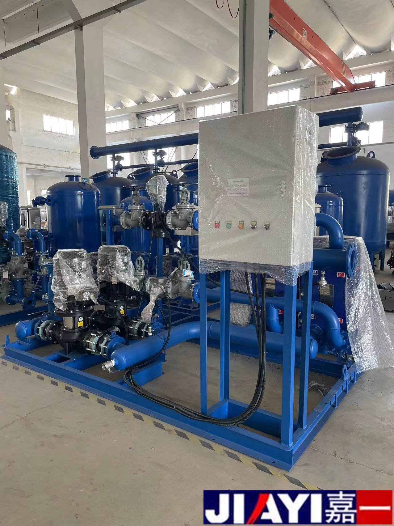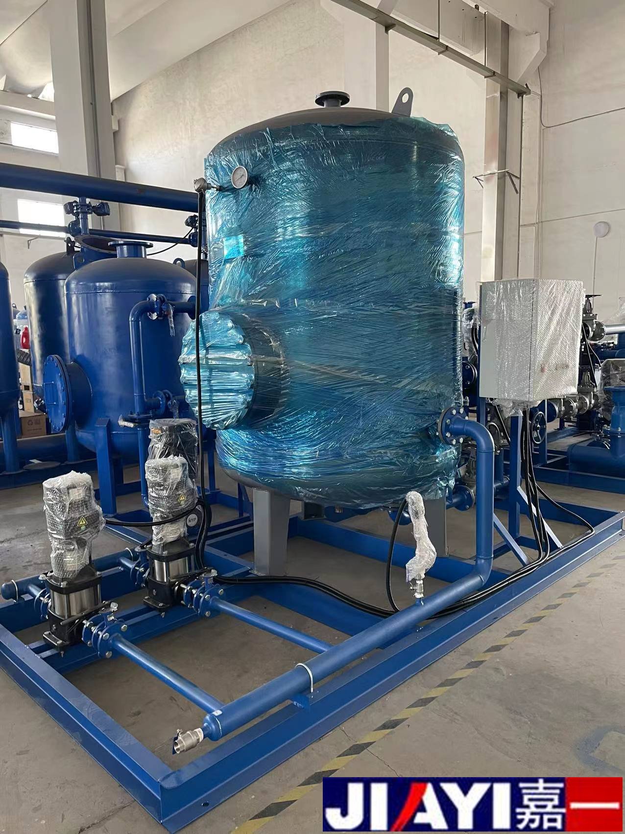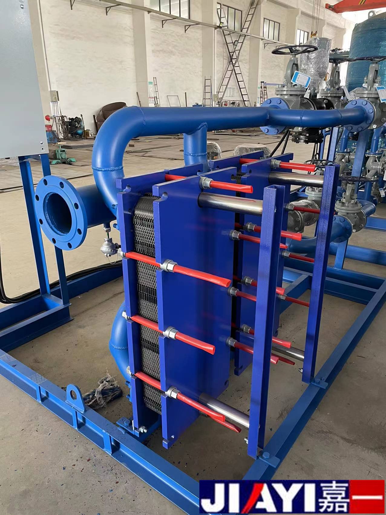 板式換熱機組,為換熱機組的一種型號,其特點是采用板式換熱器,在相同壓力損失情況下,其傳熱系數比管式換熱器高3-5倍,占地面積為管式換熱器的三分之一,熱回收率高。設備由板式換熱器、智能溫控裝置、智能電控裝置、循環泵、補水泵、穩壓膨脹水箱、補(凝)水箱、過濾器、閥門、儀表、傳感器、配管底座等組成。